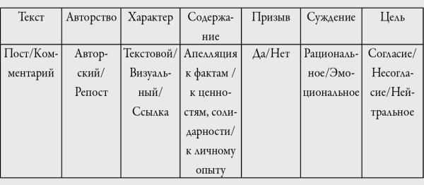 Наш методический подход основан на использовании приемов качественного контент-анализа[175], предполагающего распределение пользовательских сообщений и суждений по категориям с последующей интерпретацией полученных типов аргументации. Отобранные в ходе работы с материалом сообщения на тему протестных действий относятся к различным категориям в соответствии с разработанной схемой (при необходимости в нее вносились некоторые модификации в зависимости от анализируемой площадки).