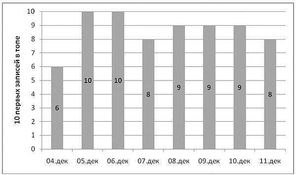 Рассмотрим тематическое насыщение рейтинга «Яблор» за декабрь. Из графика, представленного ниже, видно, что уже с начала декабря верхние позиции в рейтинге занимают записи о выборах в Государственную думу[184].