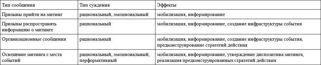 Типы выделенных нами сообщений хронологически соответствуют этапам осуществления события, начиная с подготовки митинга и заканчивая последующим обсуждением впечатлений. При переходе от первого к четвертому типу мы обнаруживаем увеличение числа производимых сообщениями и содержащимися в них суждениями эффектов, максимальное сочетание которых приходится на момент прохождения митинга. К ним относятся эффекты мобилизации, информирования, использования предсозданной инфраструктуры, реализации предконструированных в Сети стратегий действия на митинге, например способов культурно выражать гнев. Так, в ходе анализа суждений мы обнаруживаем элементы и пунктирные линии диспозитива митинга, который представляет собой ансамбль находящихся во взаимной связи коммуникативных площадок для производства и аккумуляции идей, каналов распространения информации и т. д.
