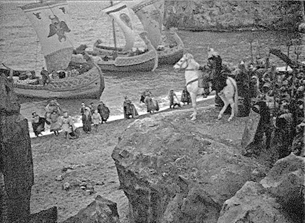 «Встреча двух миров», как любили в таких случаях писать советские журналисты: «миролюбивые» новгородцы, высаживающиеся на незнакомый берег без щитов, кольчуг и шлемов, с одним мечом на всех, и до зубов вооружённые «викинги» в рогатых шлемах и… с трезубцами – прямо черти с вилами, да и только… (Кадр из фильма «Садко» 1952 года)