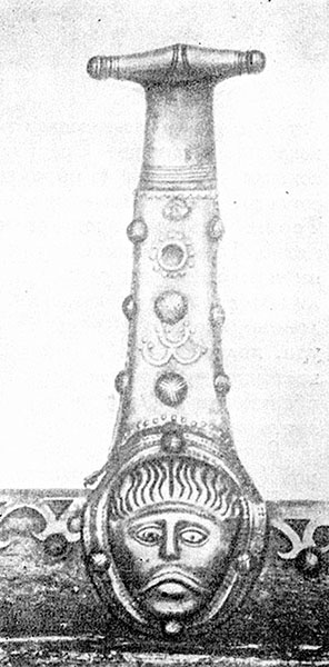 Деталь ритуальной повозки из Дейберга (Ютландия)2, в которой многие исследователи видят описанную Тацитом ритуальную повозку Богини. Личина изображает скорее кельта, балта или славянина, чем германца – коротко остриженые волосы, усы при отсутствии бороды