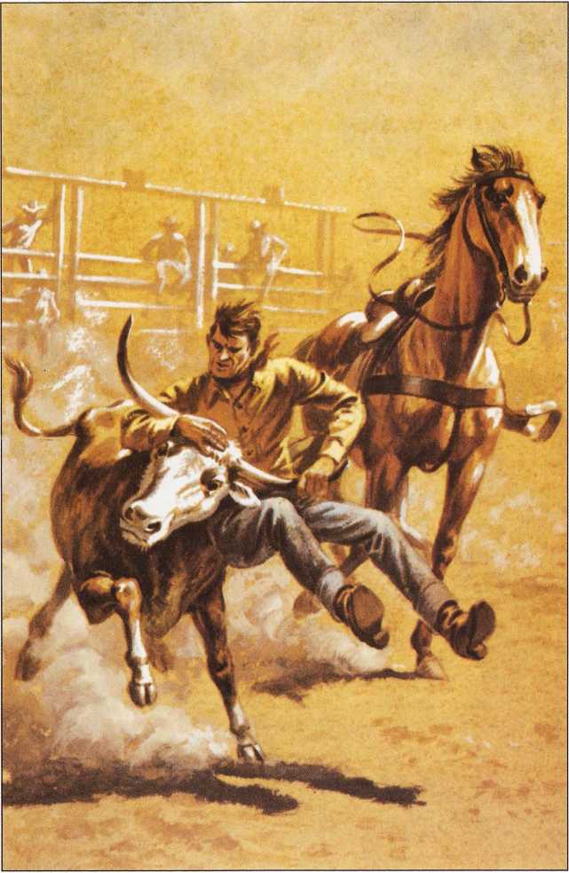 Состязания включают езду на бронко, на быках, выполнение трюков с лэриэтом и ловлю лэриэтом быков, гонку чак-фургонов и зрелищный «буллдоггинг», показанный на рисунке на соседней странице. В «буллдоггинге» ковбой скачет рядом с быком, хватает его за рога, соскакивает с лошади, пригибает голову быка за рога к земле и валит его. Соревнование выигрывает тот, кто проделает это быстрее.