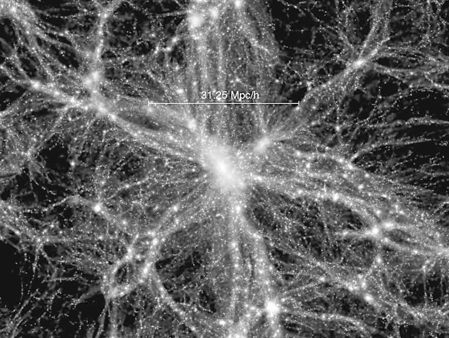 На фото — расчетная структура Вселенной по данным Millennium simulation. Отмеченное белой линией расстояние составляет примерно 141 млн световых лет. Светлым (желтым) обозначена материя, темным (фиолетовым) — темная материя, наблюдаемая лишь косвенно. Каждая светлая (желтая) точка представляет собой одну галактику