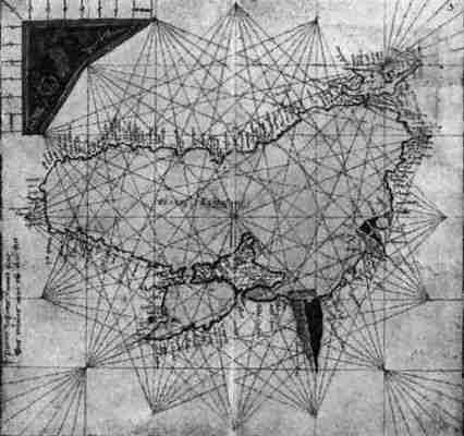 Рис. 32. Старая перевернутая карта Черного моря. Это — так называемый портолан генуэзца Пьетро Весконте (Pietro Vesconte), якобы 1318 года [1468], с. 3. Здесь отмечены пункты на берегу Черного моря. В центре карты написано Pontus Exinus. Север находится ВНИЗУ, юг — НАВЕРХУ, восток — СЛЕВА. Восток называли LEVANT (левый?) [1468], с. 37. На карте Весконте полуостров Крым, в частности, изображен «вверх ногами» по отношению к привычному нам сегодня его положению на современной карте. Взято из [1468], карта 3.
