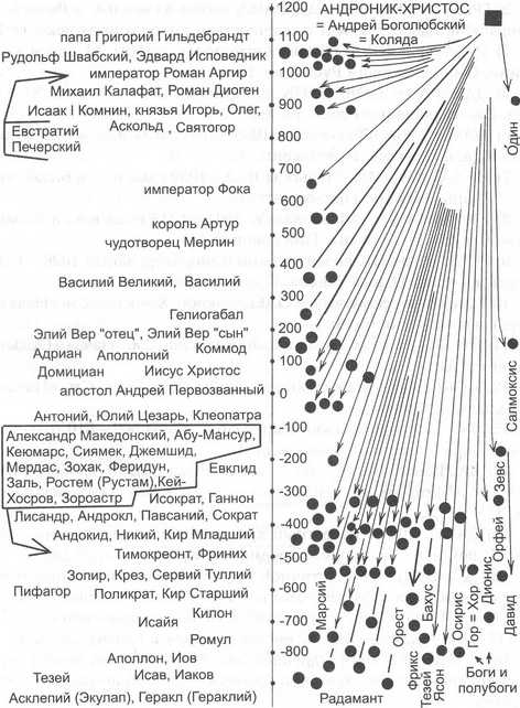 На рис. 9.4 приведены скалигеровские датировки всех обнаруженных нами к настоящему моменту 86 отражений императора Андроника-Христа, то есть великого князя Андрея Боголюбского. Этот список существенно расширяет таблицу, приведенную нами в книге «Геракл». Получился впечатляющий перечень «фантомов». На рис. 9.4 они приблизительно упорядочены по их скалигеровским датировкам (подавляющее большинство которых ошибочно). В приводимой ниже таблице мы указываем также те наши книги, где обнаружены и исследованы фантомные отражения Андроника-Христа.