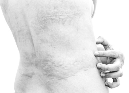 Солнечная крапивница разъедает не только шею, руки и предплечья, но и скрытые под одеждой части тела.