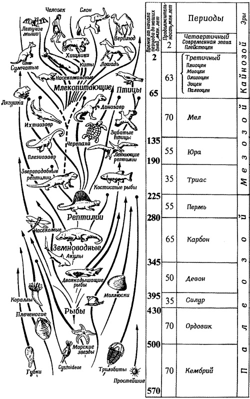 Эволюция животных (по М. Кальвину). Точки на конце линий – вымирание