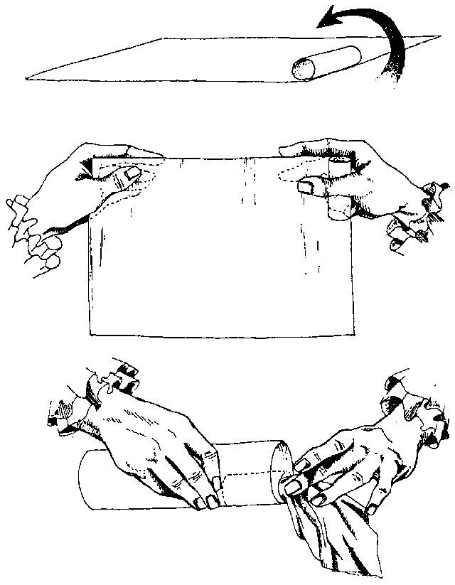 Переднюю часть я показывал вам медленно, а заднюю — быстро, потому что держал лист своей правой рукой, не собранной в кулак. Я не хочу, чтобы вы заметили, что в моей руке скрывается маленькая бумажная трубочка, прикрепленная к краю большого листа. Затем я скатываю большой лист и держу его при этом моей левой рукой, а потом пропускаю три белых носовых платка — правой рукой.
