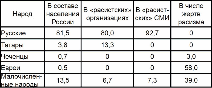 Числа статистического анализа показывают, что после чтения этого «доклада» человеком, не подозревающим, что ему лгут и зомбируют пропагандой, у него сложится убеждение, что русские и татары являются органическими расистами, немотивированно совершающими физическое и моральное насилие над любыми иноплеменниками. У такого человека сложится убеждение, что особенно тяжело и даже бесперспективно жить в России евреям, ведь они подвергаются от русских и татар дискриминационному насилию в среднем в 40 раз чаще, чем другие малочисленные народы. Вот это число (58 % насилий – жертвы «антисемитизма») показывает, что запугивание российских евреев угрозой погромов от русских и татар является главной целью «доклада».