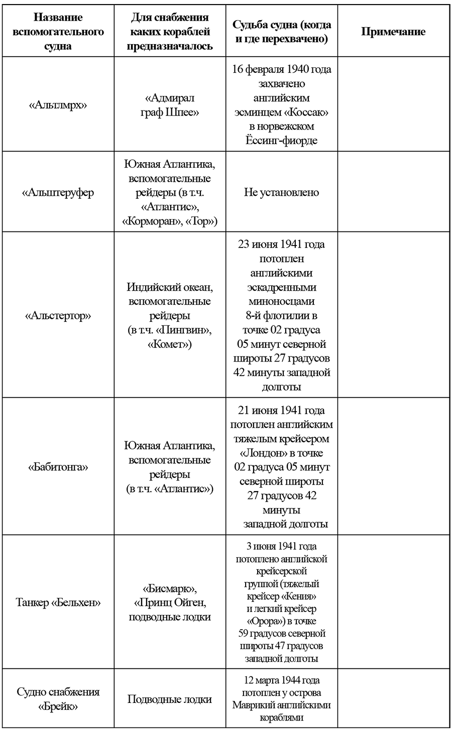 Приложение 4. Судьба германских вспомогательных судов, обеспечивавших деятельность рейдеров во Вторую мировую войну[132]