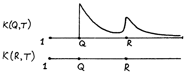 Пусть интервал времени (А, В) описан в летописи X, разбитой на «главы-поколения» X(T). Пусть они в целом занумерованы хронологически верно, НО СРЕДИ НИХ ЕСТЬ ДВА ДУБЛИКАТА, то есть две «главы», говорящие об одном и том же поколении, дублирующие, повторяющие друг друга. Рассмотрим простейшую ситуацию, когда одна и та же «глава» встречается в летописи X ровно два раза, а именно с номером Q и с номером R. Пусть Q меньше R. Наша методика позволяет обнаружить и отождествить эти дубликаты. В самом деле, ясно, что частотные графики К(Q, T) и К(R, T) имеют вид, показанный на рис. 26.