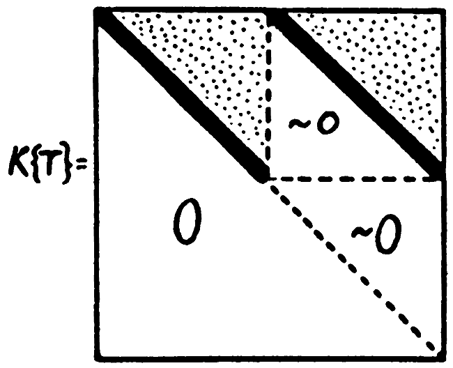 Эта методика также была проверена на экспериментальном материале. В качестве простого примера было взято издание «Истории Флоренции» Макиавелли 1973 года (Ленинград), снабженное развернутыми комментариями. Ясно, что комментарии можно рассматривать как серию «глав», дублирующих основной текст Макиавелли. Основной текст был разбит на «главы-поколения», что позволило построить квадратную частотную матрицу KT, охватывающую и комментарий к «Истории». Эта матрица имеет вид, условно показанный на рис. 27, где жирные наклонные отрезки состоят из клеток, заполненных максимумами. Это означает, что наша методика успешно обнаруживает известные дубликаты. В данном случае — комментарии к основному тексту «Истории» Макиавелли.