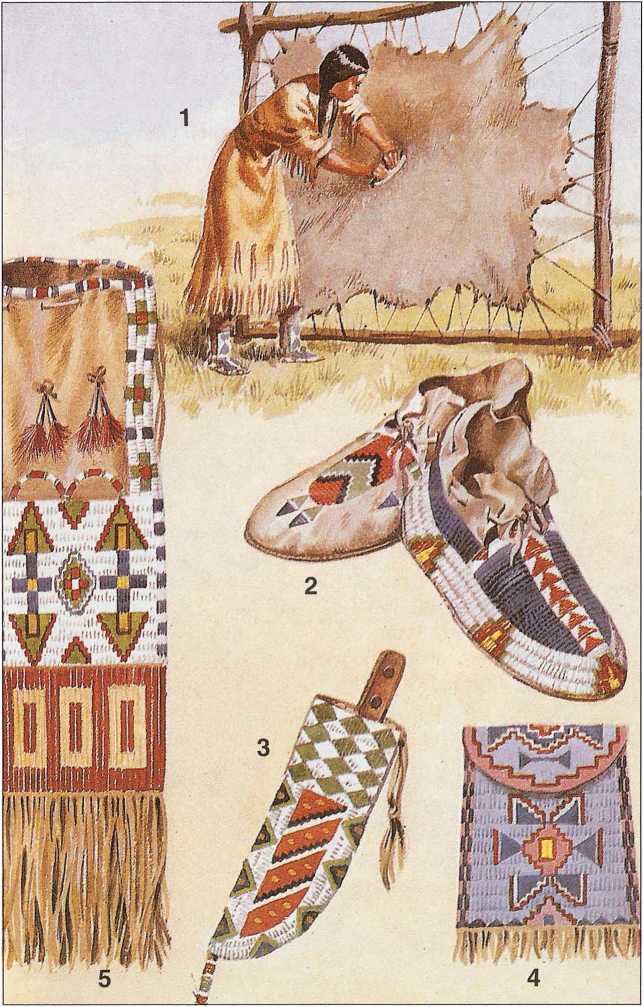 Мужчины охотились, а женщины обрабатывали шкуры убитых животных. Эта работа была очень тяжелой. Растягивание, скобление, натирание смесью жира и мозгов, чистка и мягчение — все эти операции по обработке шкур требовали много труда и времени. Индеанки так прекрасно дубили шкуры оленя, лося и антилопы, что те становились мягкими, как бархат.